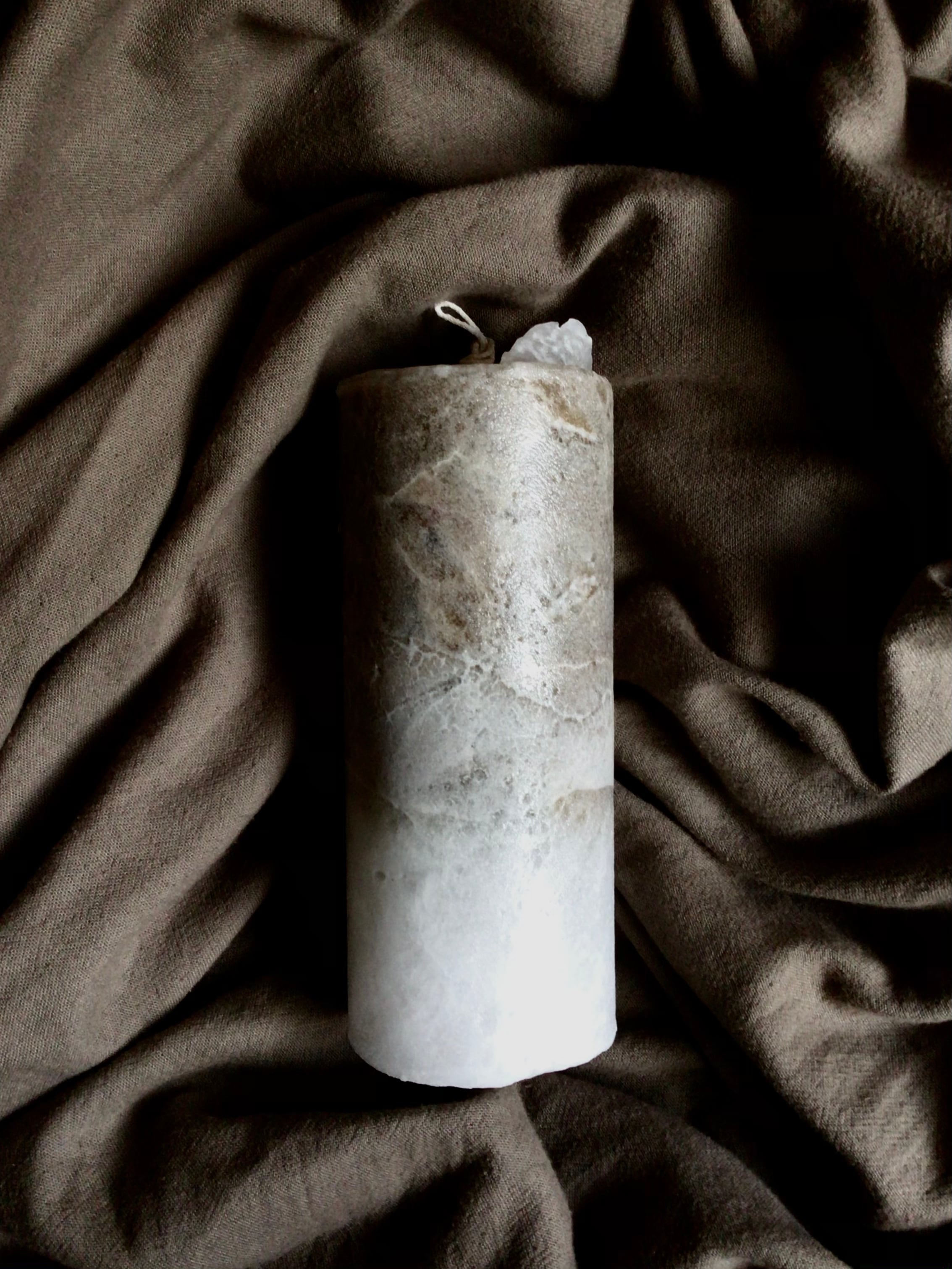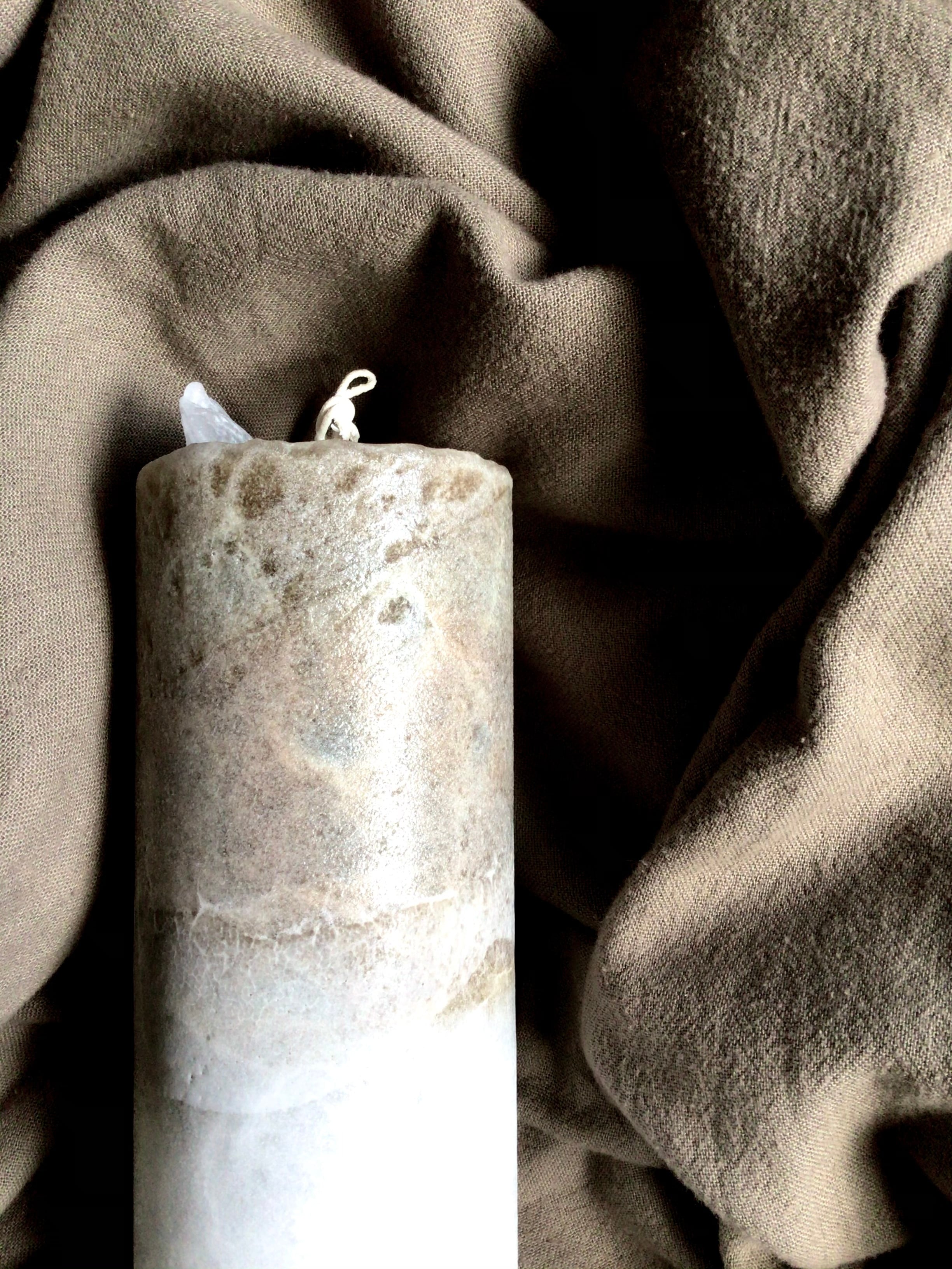 森の蝋燭という名の灯りです。詩人の長田弘さんの夜の森の道という詩にインスピレーションを得て、夜の森に一本の蝋燭を持って行ったときの記憶を蝋燭に宿しました。夜の森は空の黒よりも暗く、深い静けさに包まれていました。どこからか鹿の鳴き声が響き、その声は森そのものの息づかいのように、夜の静寂をふるわせていました。日常にいると忘れてしまう感覚。闇は暗く恐ろしいもの。しかし一度その闇に包まれると、私たちは闇の中から生まれ、闇の中に帰ってゆくんだという安堵に包まれてゆく。一本の灯りは森の静寂をいっそうと濃いものにしていきました。