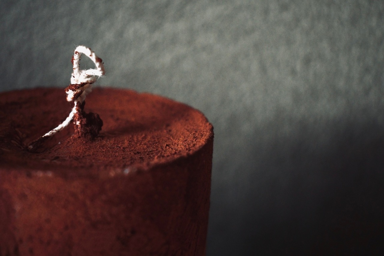 広島の西条という地域にあるご縁ある山より頂いた赤土を化粧がけした蝋燭です。深紅の赤土によってプリミティブな明かりが灯ります。経年変化によってトップの部分の赤土が剥がれ落ちることがありますが、ご使用には問題ありません。